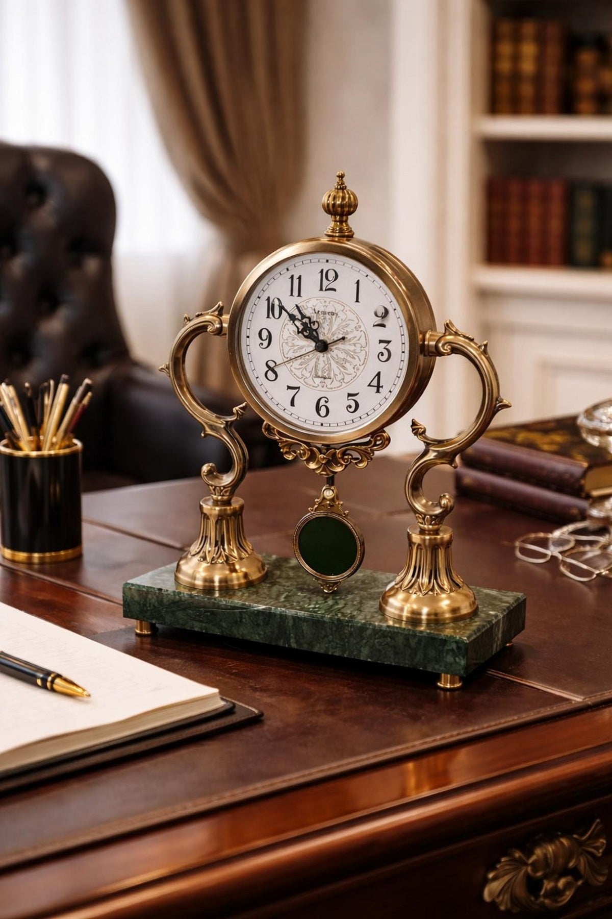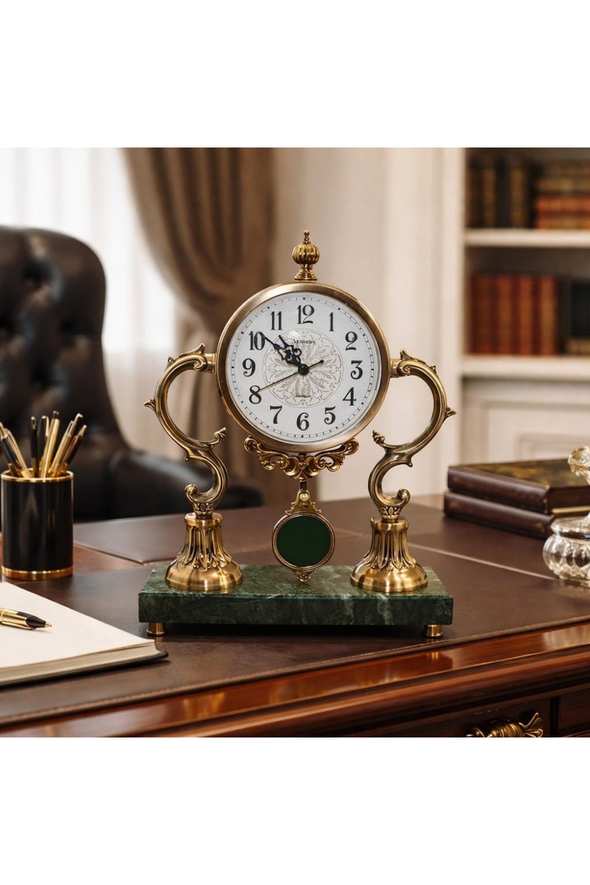 İskandinav Tasarım Mermer Kaideli Sarkaçlı Metal Masa Saati Premium Dekoratif Saat